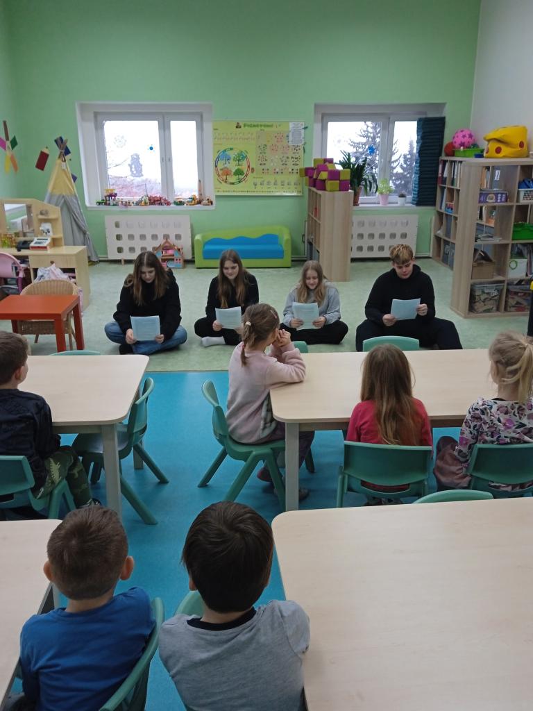 V lednu přišli žáci z 8. třídy přečíst dětem v MŠ zimní pohádku O ztracené vločce.